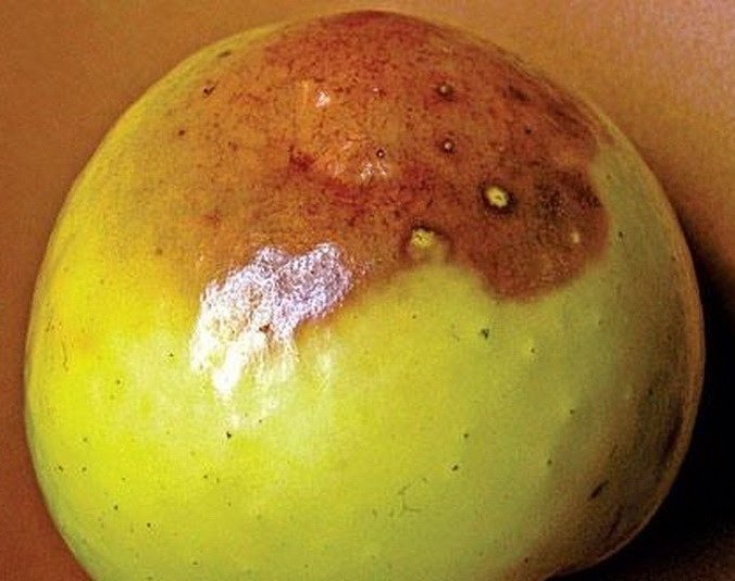 На пораженных плодах образовываются черные пятна, плоды становятся уродливыми, часто непригодными к употреблению.