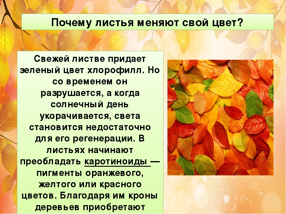 По мере прихода осенних холодов листья листопадных деревьев меняют окраску преимущественно с зеленой на желтую. Это происходит из-за разрушения хлорофилла в связи с сокращением длительности светового дня, понижением температуры, нехватке влаги. Питательные вещества и влага постепенно покидают отработавший свое лист.