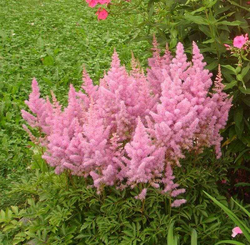 - Астильба Арендса (Astilbe arendsii) – хорошо известный, но недооцененный многолетник. Незаменим в тенистых, сырых садах, у воды. Высаживается большими группами, во время цветения поражает белыми, кремовыми, розовыми цветами, собранными в крупные, разветвленные и плотные метелки. Вырастает до 60 см в высоту. Листья перистые. Цветет в июне-июле. Любит полутенистые места.