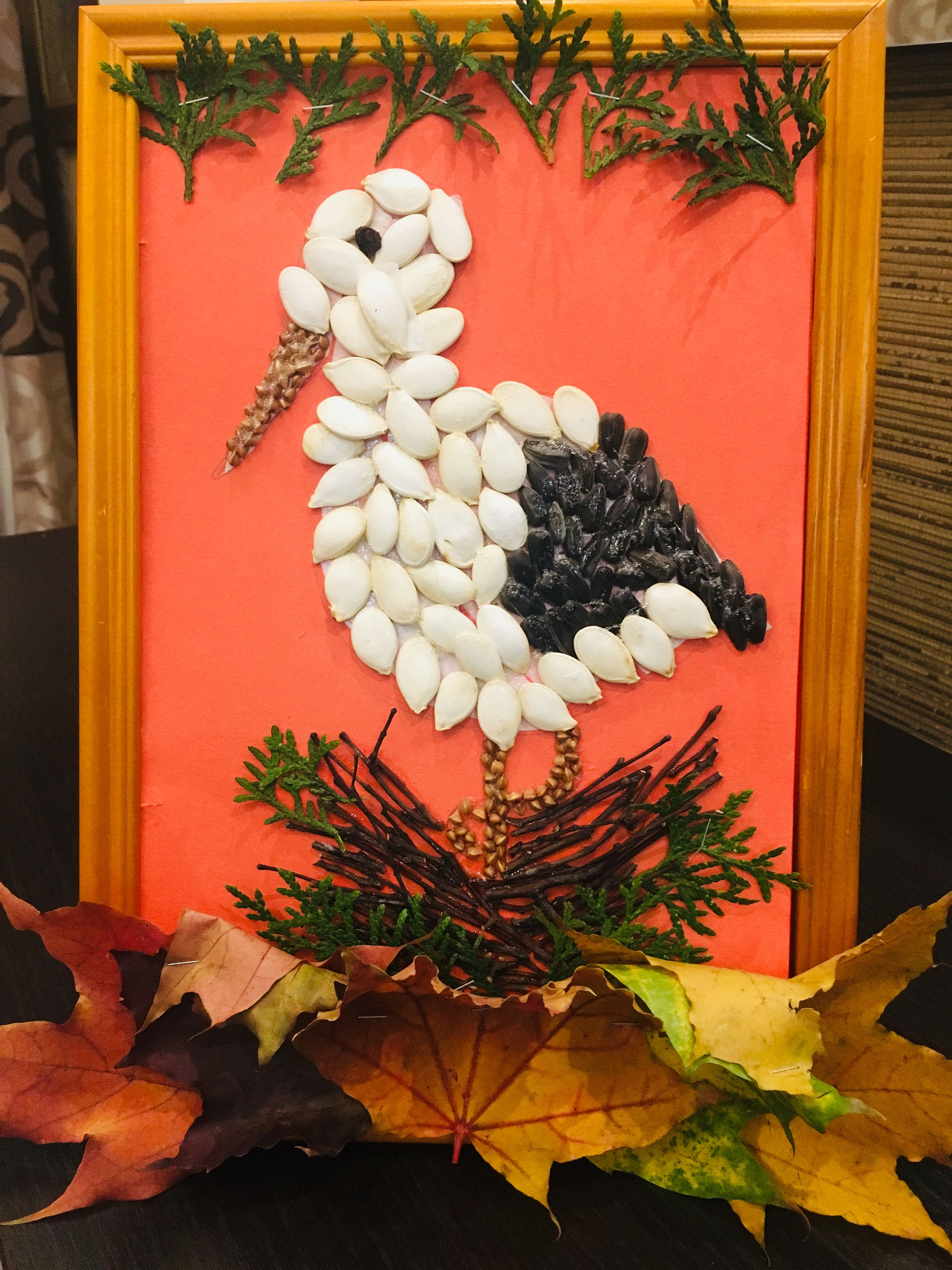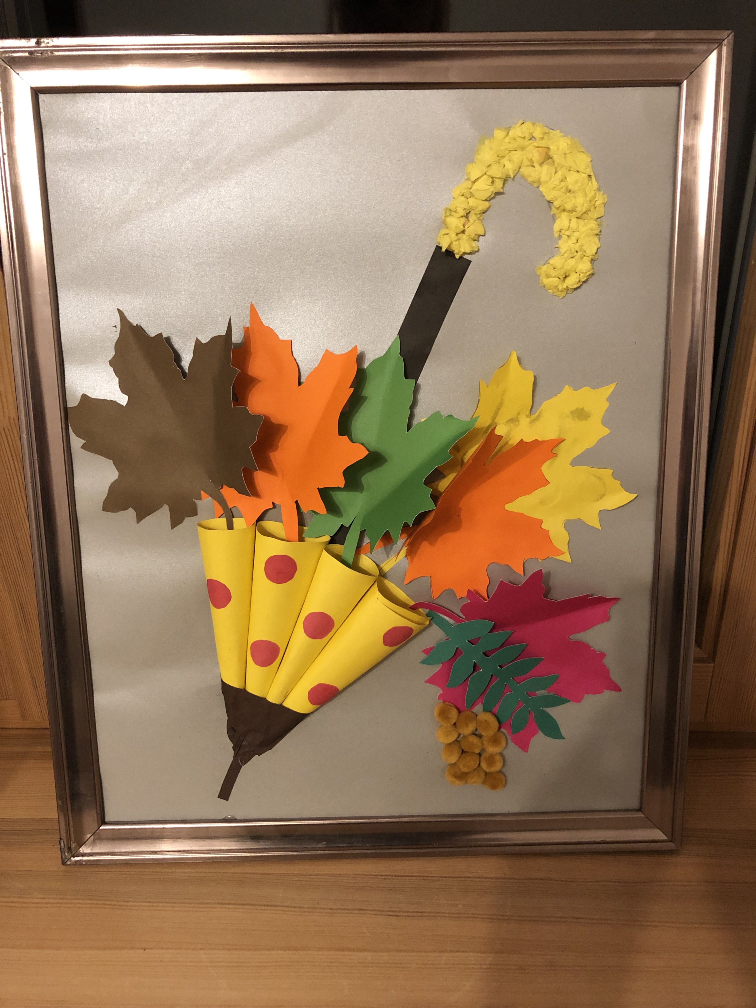 Утром наш осенний пейзаж мы вставили в рамку и отнесли в детский сад. Обещали вернуть, и если всё таки это произойдёт, покроем картину лаком, чтобы со временем пшено не осыпалось, и повесим на стену.