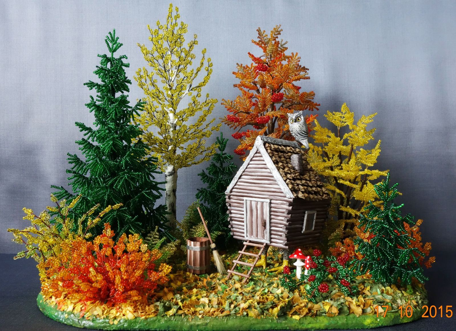С зелёным деревом посложнее. На нём 2 оттенка зелёного, и, начинающие желтеть листья, жёлтые и оранжевые, а в самом конце щепотка коричневого с той стороны, где тень.Есть один важный нюанс: нельзя одинаково плотно засыпать деревья и траву, получается просто хаос цвета, где не видны формы и предметы. Я это поняла только тогда, когда мы всё плотно засыпали. Пришлось взять деревянную палочку и убирать часть пшена с травы под деревьями.