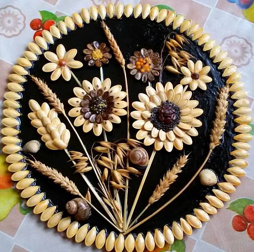 Сын наносил клей с моей помощью, чтобы не выходить за контуры, а крупой посыпал уже сам и остался очень доволен процессом.