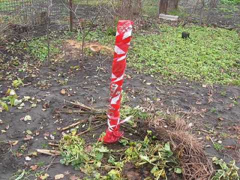 На зиму позаботьтесь о своём новом питомце. Обвяжите ствол, можно с доской вместе, лапником или белыми мешками из-под сахара. Это спасёт от мышей и солнечных ожогов. Весной, в апреле не забудьте всё это снять. На приствольный круг положите два слоя гофрированного картона, корням зимой будет теплее. Но, гофрированный картон любят червяки. Я обычно прежде, чем сжечь картон весной, осматриваю его и убираю червяков. Этих тружеников жаль отправлять в костёр.