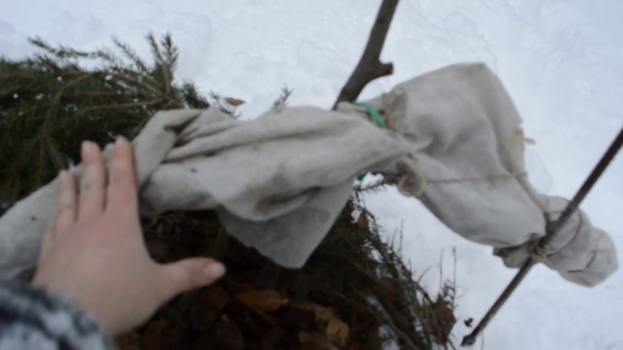 Обёртываем стволики еловым лапником и обвязываем бечёвкой (от грызунов).