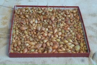 После всех произведенных операций севок обязательно рассортировывается. Небольшие луковички размером до 1,5 см лучше отложить и высадить под зиму, в начале октября. А крупный урожай комплектуется по 10-15 кг и засыпается в ящики или холщовые мешки. Затем их помещают в полиэтиленовые пакеты, хорошо завязывают и хранят в темном месте при температуре +17-18 градусов.