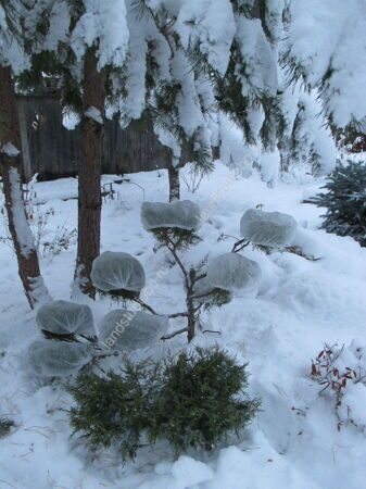 Кипарисовики, колонновидные можжевельники, некоторые сорта туи и ели канадской нужно обязательно защитить от солнечных ожогов. Для этого осуществляется укрытие хвойников на зиму специальным материалом. Для такой цели хорошо подойдет: мешковина, притеночная сетка, тканые пропиленовые полотнища.