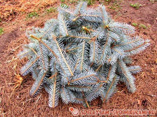 Приствольные круги необходимо замульчировать органикой, можно использовать опилки, хвою или лапник. Особенно важно это для молодых, посаженных в этом или прошлом году, хвойников. Ранней весной мульчу нужно снять, чтобы почва под деревьями скорее прогрелась.