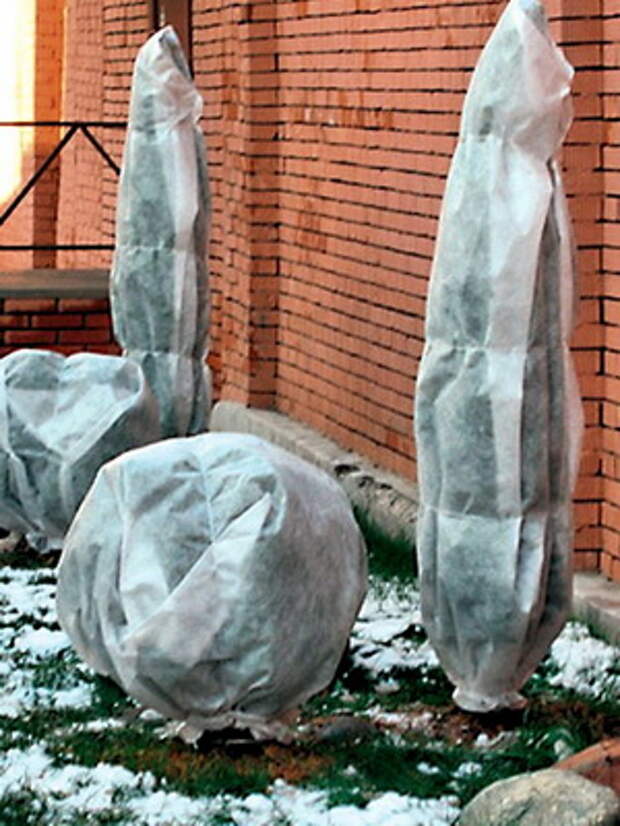В качестве защиты кроны используйте мешковину, крафт-бумагу, светлую хлопчатобумажную ткань (лучше, если слоев будет несколько). Плотно не перетягивайте, чтобы не повредить ветви. Небольшие по размеру растения просто укройте лапником.