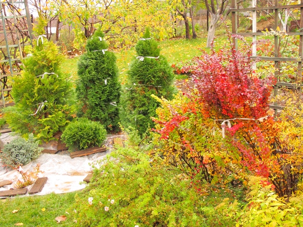 Поэтому осенью их необходимо обвязать шпагатом, желательно синтетическим, он не размокнет и не порвется. Небольшие хвойные деревья и кусты можно обернуть сеткой.