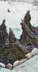 Снег вокруг растения притаптывается или расчищается. Теперь оберните вокруг него материал, полностью прикрывая хвою. Швы скрепите степлером, в верху оставьте просвет для дыхания (с теневой стороны, так чтобы солнечные лучи не падали на хвою). Существуют также каркасный способ укрытия – вокруг растения устанавливается каркас и накрывается сшитым из агроспана колпаком. Укрытие и колпак закрепляют колышками. Виды каркасных укрытий вы можете посмотреть на нашем сайте.