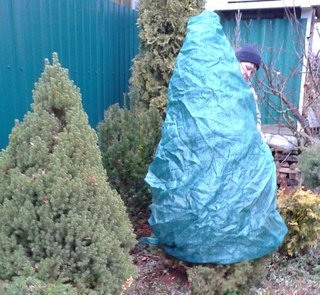 Вечнозеленые деревья не «засыпают» на зиму, в отличие от листопадных. Их зеленые хвоинки или листочки и зимой продолжают вырабатывать хлорофилл, но только в меньшей степени. А для выработки хлорофилла, как известно, требуется солнечный свет. Поэтому укрывать вечнозеленые деревья плотным, не пропускающим свет материалом нельзя. Если вы сомневаетесь в морозостойкости вашего хвойника, неплотно обвяжите его на зиму редкой мешковиной. Ни в коем случае не используйте полиэтилен или толстый нетканый материал, это может привести к выпреванию растения, особенно если зима будет с оттепелями. Нетканые материалы, такие как лутрасил, агротекс или спанбонд, которые сейчас так популярны, зимой не используют. Они пропускают тепло внутрь и не отдают его обратно, поэтому в зимние месяцы растения под ними легко выпревают.