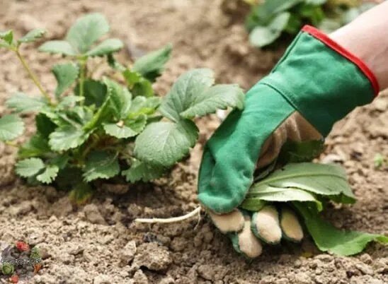 - Участок с клубникой нужно очистить от сорняков, разрыхлить почву и обложить ее измельченным коровяком или конским навозом, уложив на них еще совсем молодые усики.