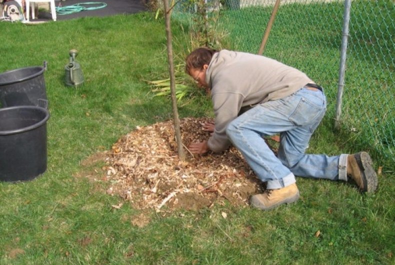 Если же грунтовые воды проходят глубоко, и в поднятии саженца на холмик нет, то можно без предварительной подготовки можно провести технику посадки саженцев с последующим мульчированием. Яма выкапывается неглубокая, на штык лопаты. Затем вокруг саженца в диаметре полутора метров распределяется ровным слоем 3 ведра старого перегноя, и проводится перекопка. Грунт поливаем и мульчируем толстым слоем соломы или торфа (высота 5-7 см).