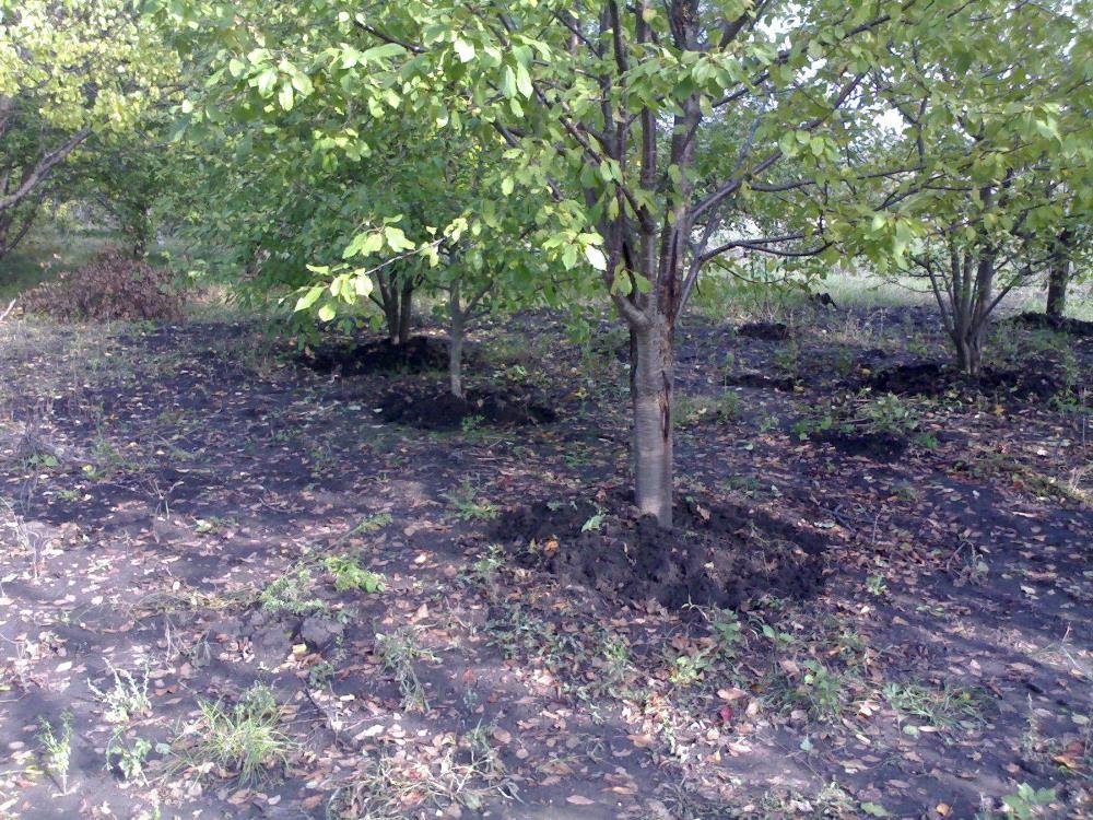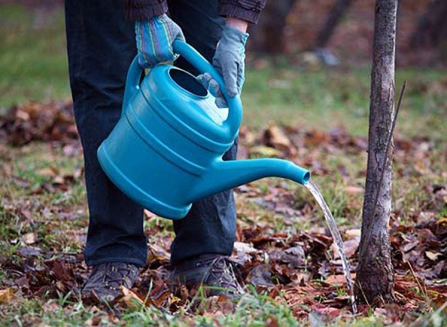 Чтобы правильно внести зольное удобрение и обеспечить усвоение деревьями, нужно сначала полить почву. Но осенний полив – это не 2 – 3 ведра. В зависимости от возраста дерева и размеров его кроны может уйти 200 – 250 л воды под каждое. Чтобы вода хорошо впитывалась и не разливалась по участку, почву вокруг ствола перекапывают.