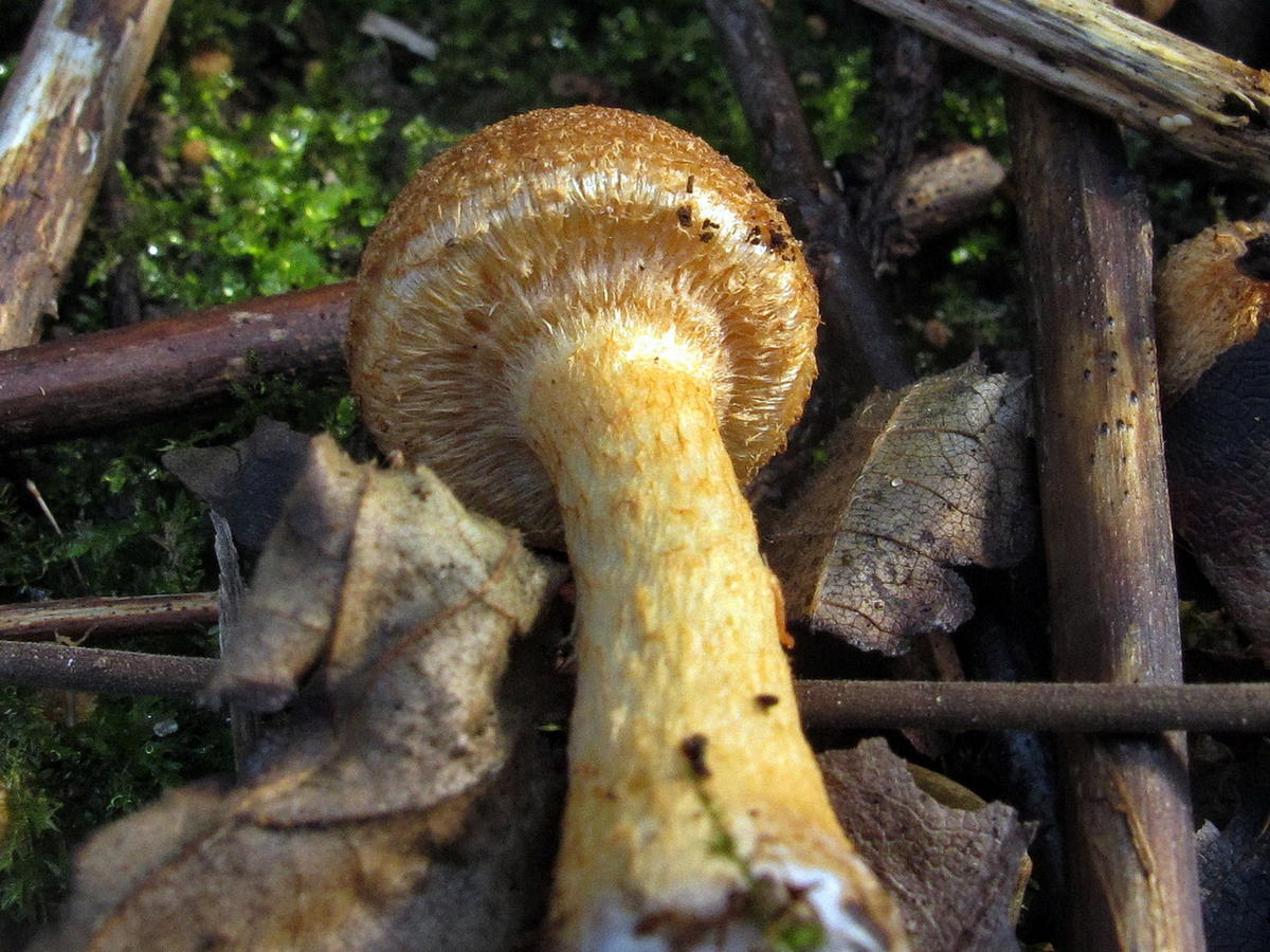 Шапочка молодых опят полусферическая. С «возрастом» становится плоской и открытой. Цвет желтый или коричневый, не яркий. Сверху можно заметить слабые чешуйки.