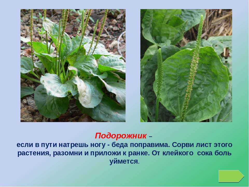 Подорожник является отличным лекарственным средством для человека. Он прекрасно снимает воспаление, служит антисептиком, заживляет и затягивает раны, положительно влияет на секреторную функцию желудка, снимает боль, а также оказывает отхаркивающее и кровоочистительное действие. Его используют как мощное обезболивающее, противовоспалительное и антисептическое средство.