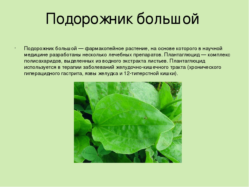 Правда, сок готовят, смешивая 3 вида подорожника — большой, ланцетный и блошный. Лист подорожника рекомендуют при пониженной кислотности желудка, а выделенные из листьев полисахариды (слизь) — препарат «плантаглюцид» применяют при повышенной кислотности.