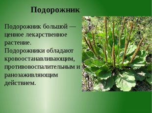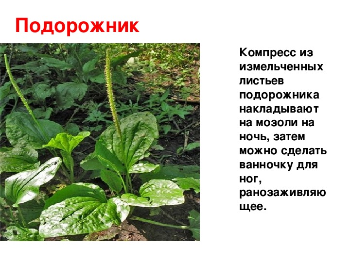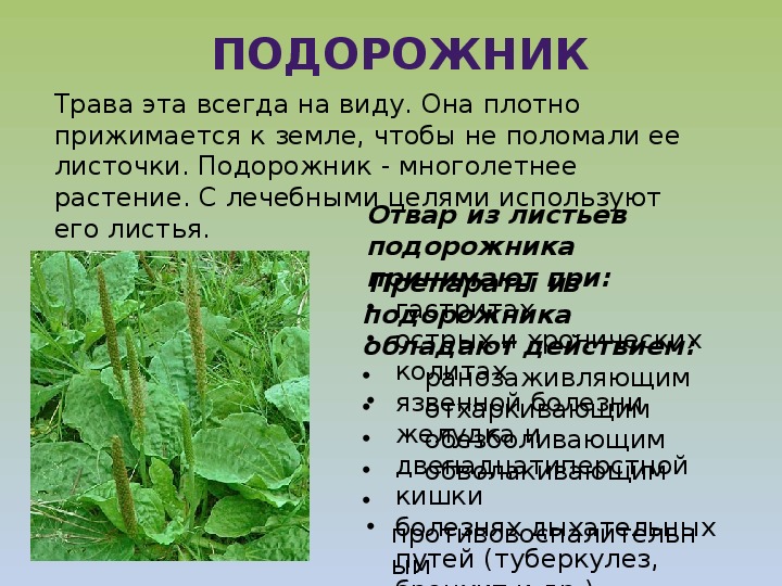 Растение «подорожник» лечит раны, бронхиты, коклюш, бронхиальную астму, туберкулез, хронические гастритаы, язвенную болезнь желудка и двенадцатиперстной кишки, ушибы, свежие порезы, хронические язвы, свищи, нарывы, фурункулы, гнойные раны, фурункулез, трещины сосков.