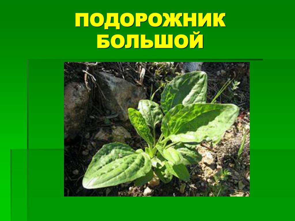 Подорожник большой — многолетнее травянистое растение высотой 15-50 см, семейства подорожниковых (Plantaginaceae). Латинское название подорожника — plantago. Народные слова: придорожник, порезник, попутник, чирьевая трава, трипутник, ранник, поранник, бабка, семижильник. На всех языках это растение связано с дорогой, и не удивительно, ведь подорожники расселяют свои мелкие семена, приклеивая их к ногам, лапам, копытам, колесам — всему, что движется и прокладывает дороги. «Бесшабашен и не осторожен, но в стремленье к людям он силен, где дороги, там и подорожник, даже на тропинке — тоже он. (Б. Карпенко)»