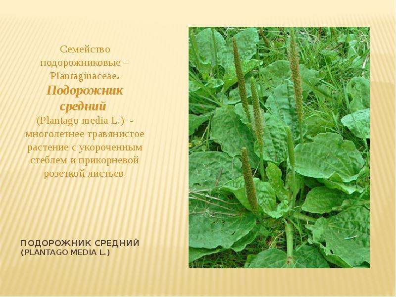Виды : Семейство подорожниковые – одно-, дву-, или многолетние небольшие травянистые растения. Цветки мелкие, правильные, спайнолепестные. Чашечка 4-раздельная, венчик в виде сухоплёнчатой, 4-раздельной трубочки, тычинок 4, далеко выдающихся из венчика. Соцветие – колос или головка. Плод – двухгнёздная открывающаяся коробочка.