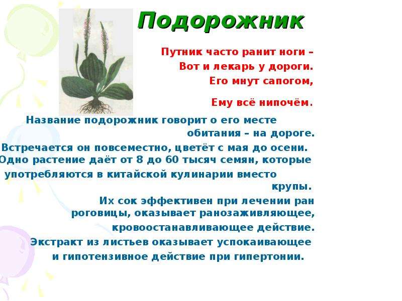 Листья этого растения помогают остановить кровотечения, заживить раны, застарелые и свежие язвы, унять зубную боль. Кроме того, препараты подорожника расслабляют гладкую мускулатуру желудочно-кишечного тракта, устраняют боль, возникшую из-за спазма гладкой мускулатуры кишечника или желудка.