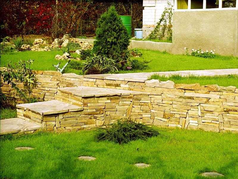 Природный камень отлично подходит для декоративных целей. Стенка, изготовленная из этого материала, выделяется на участке и приковывает к себе взгляд. Он придает динамику и ритмичность подпорному сооружению.