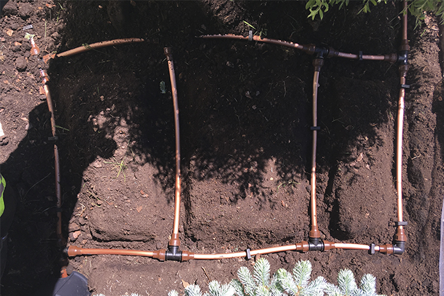 Выкапывается траншея, куда будет закапываться шланг, и сам шланг помещается в траншею. Используются гибкие шланги, поэтому прямые линии не требуются. Патрубки прикрепляются к отрезкам шланга через запланированные промежутки с помощью фитингов из ПВХ.
