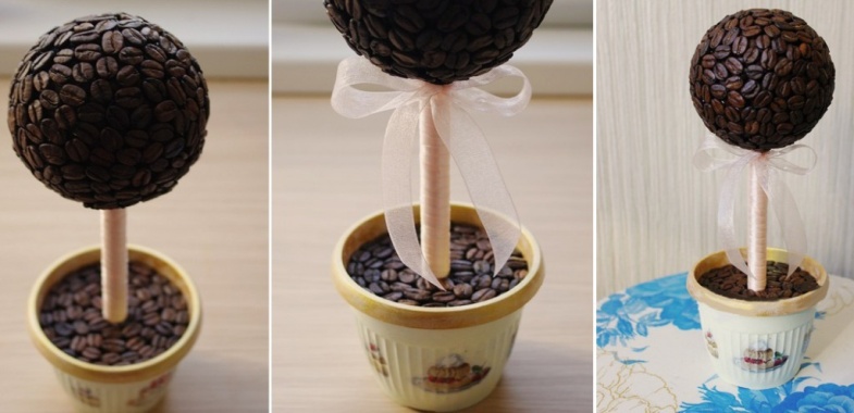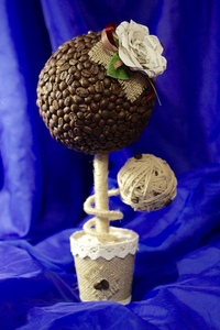 Небольшой топиарий из кофе на фото выполнен на основе пенополиуретана, а вместо горшка я использовала обыкновенную пластиковую баночку от плавленого сыра, которую обтянула тканью. Кстати, ствол – обычный простой карандаш, так что все необходимое для творчества всегда можно найти под рукой, если проявить немного фантазии.