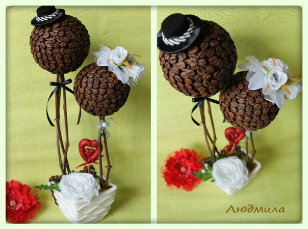 Самый первое дерево счастья, с которыми мне довелось познакомиться, было как раз кофейное. Красивые, ровные ароматные зерна ровным слоем покрывали крону симпатичного растения, посаженного в небольшой керамический горшок. Композицию завершали ажурные бабочки из глянцевого белого картона и декор из тонкого хлопкового кружева. Такая красота!