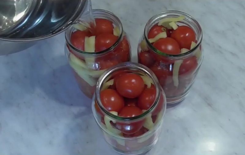 Томатный сок для заливки черри готовится без уксуса и пряностей и из обычных зрелых помидоров. Готовятся такие помидоры без стерилизации и 2-кратной заливкой.