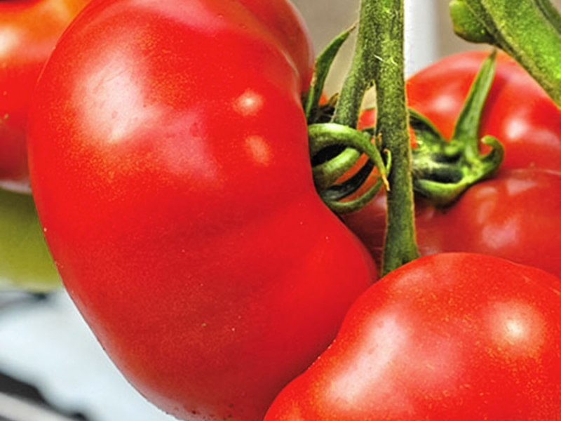 Первая кисть образуется после 7 листа, последующие – через 2 листа. В каждой грозди завязывается 3-5 плодов. Они крупные (до 150 г), округло приплюснутые, розово-малинового оттенка. Мякоть сахарная, нежная, шкурка плотная, но не жесткая.