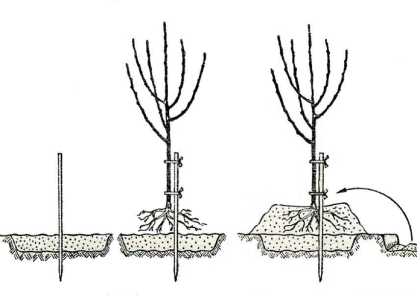В день посадки нужно сделать в почвенной горке углубление, залить его водой и поставить туда саженец, аккуратно расправляя его корневую систему. После этого нужно привязать деревце к опоре (деревянному колышку) и засыпать землей, оставляя корневую шейку саженца примерно на 3-4 см над уровнем земли. Затем необходимо сформировать вокруг абрикоса приствольный круг, а почву по краям посадочной ямы нужно слегка уплотнить.