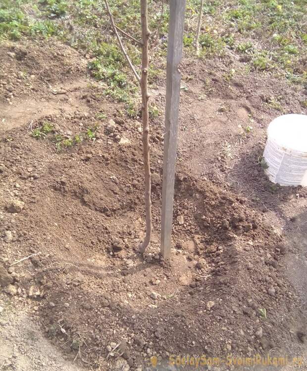 Посадку дерева лучше проводить вдвоём, но если желающих помочь не нашлось, то справиться можно и в одиночку. Сперва на дно ямы нужно насыпать небольшой холмик, на который устанавливается корень. Выровняв деревцо, и придерживая его одной рукой, второй подсыпается грунт. Яма засыпается не полностью, а до места прививки, которая должна быть развёрнута в южную сторону. Теперь осталась самая малость: уплотнить грунт ногой и полить. В первый раз полив должен быть обильным, поэтому без раздумий выливайте два ведра воды. Впоследствии деревцо поливайте нечасто, давая грунту хорошо подсохнуть.
