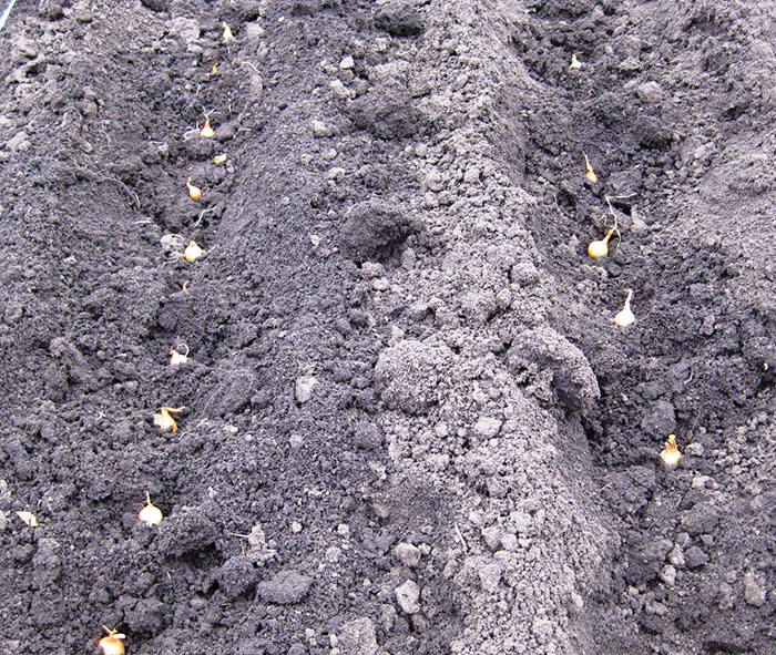 На грядках делают бороздки или лунки с расстоянием между рядами в 15 см, а сажают севок на расстоянии друг от друга примерно в 6-7 см. Глубина бороздок или лунок должна быть 5 см.