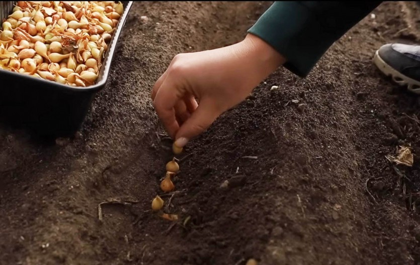 В грядке делают борозды, оставляя 20–30 см между ними. Саженцы располагают в бороздах с интервалом 8–10 см, луковички заглубляют на 2 см, междурядья поливают и мульчируют. Землю под посадками на протяжении первой недели поддерживают во влажном состоянии, проводя периодические поливы. Дальнейший уход ничем не отличается от привычного ухода за луком, выращенным из севка.