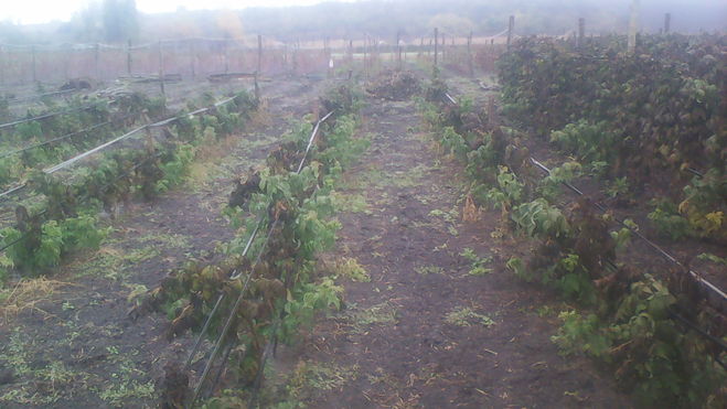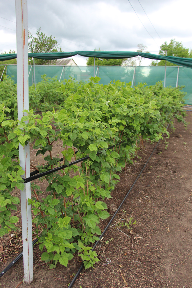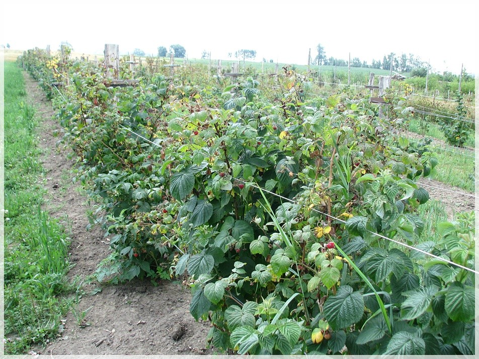 Красная и желтая малина (в ряду 2–3 фута, между рядами 10 футов) с низкой решеткой.