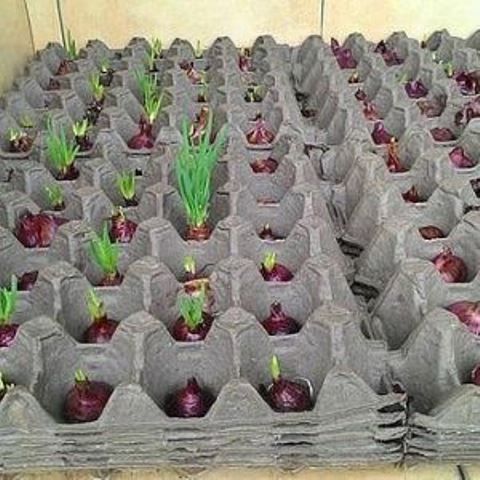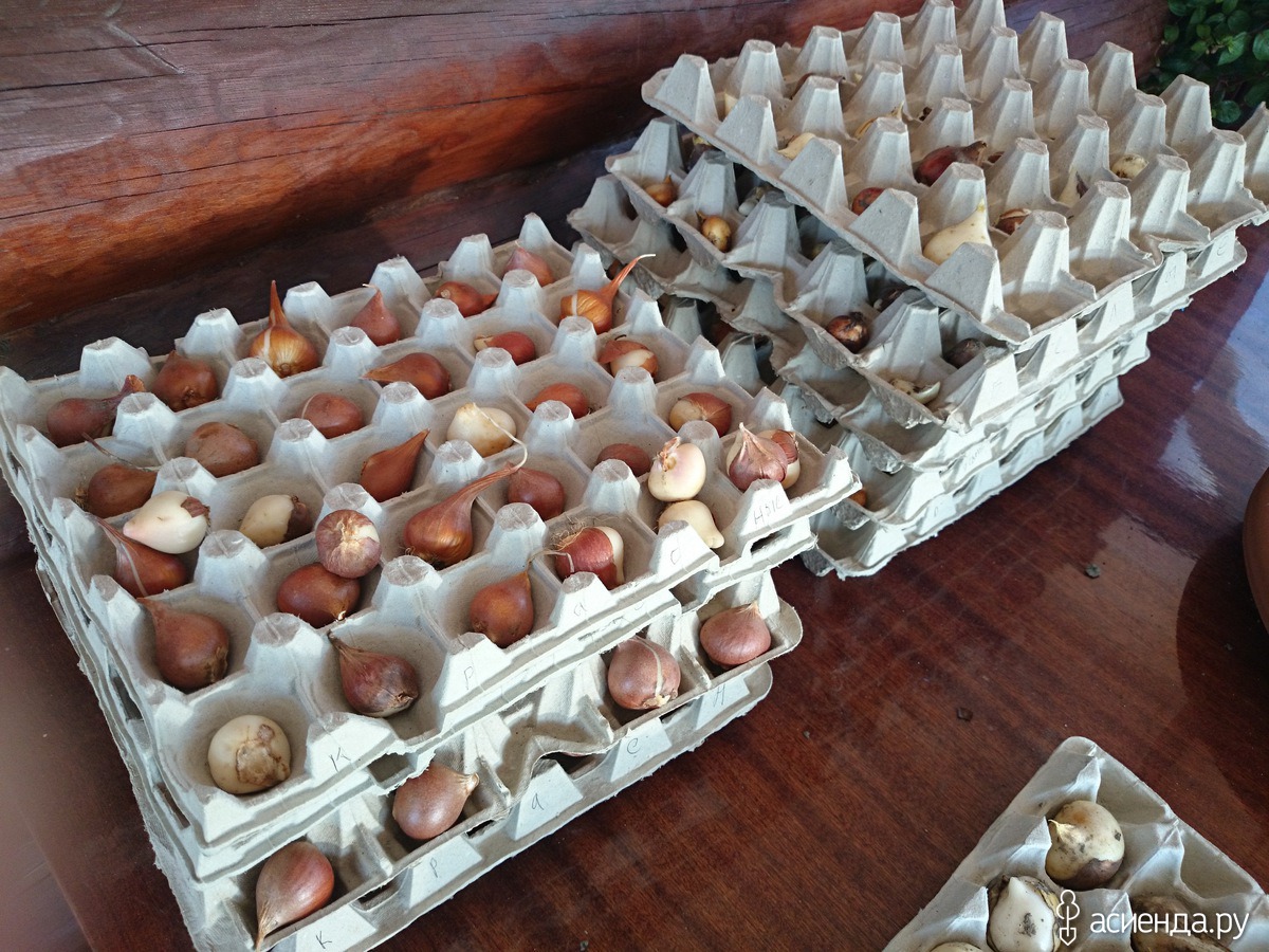 Использование картонных коробок для яиц, как я понял, имеет свои преимущества. Если каждая луковица находится в своем отсеке коробки, если одна загнивает, болезнь не распространяется на здоровых соседей. И легко обеспечить необходимую вентиляцию луковиц, сделав прорези в крышках картонных коробок.