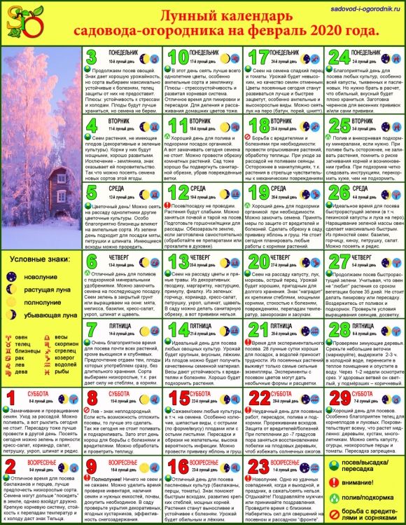 Лунный посевной календарь огородника и садовода на февраль 2020 года с указанием дней новолуния, полнолуния, четвертей Луны, расположением Луны в знаках Зодиака, а также благоприятных и неблагоприятных дней для посадки растений, в том числе комнатных. Лунный календарь огородника и садовода позволит Вам почти всегда быть в курсе того, какая в данный момент Луна. Лунный посевной календарь огородника и садовода на февраль 2020 года сможет посодействовать Вам в планировании работ в саду и огороде и сможет помочь Вам определить благоприятные и неблагоприятные дни месяца для посадки растений и ухода за ними.