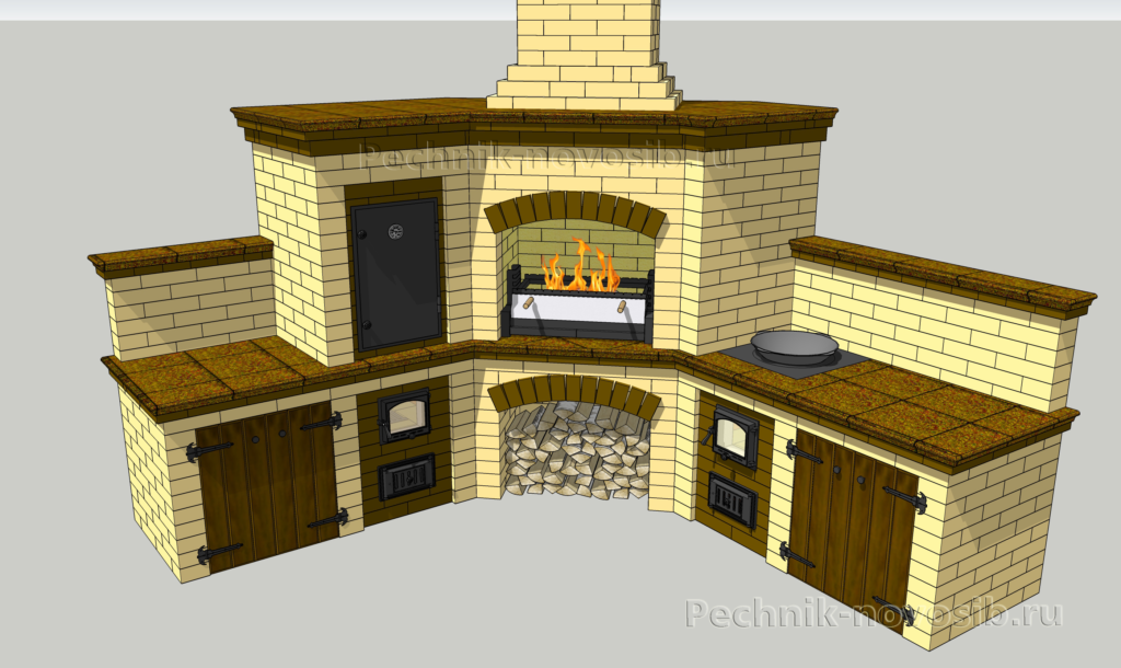 Обязательно здесь должны быть шкафы встроенного типа для провианта и аксессуаров. Для регулировки отдельных топок используется система задвижек, где компоновка может быть самой различной.
