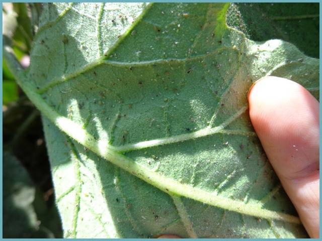 - если отогнуть край пораженного листа и посмотреть на его обратную сторону, там можно увидеть взрослых насекомых и кладки их яиц.