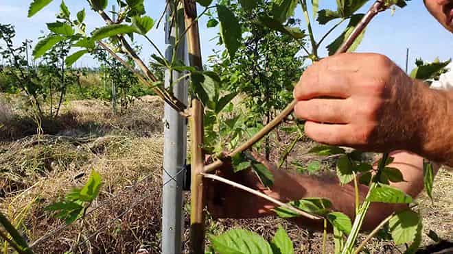 Подвязка к опоре производится на второй год после посадки. Мероприятие является необходимым для данной культуры, потому что подвязка помогает кустарнику нормально формироваться, равномерно получать солнечный свет, снижает риск грибковых заболеваний, облегчает уход за ежевикой и упрощает сбор урожая.