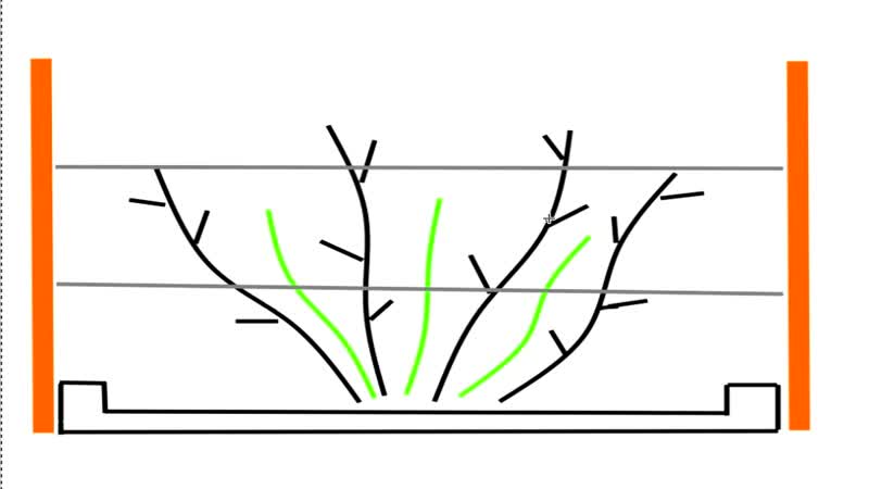 Вертикальные и полуприцепные типы хорошо работают при использовании двухпроводной системы с проводами на высоте 3 и 5 футов от земли.Как только трости достигнут верхней проволоки, удалите кончики, чтобы стимулировать ветвление. Висячие типы могут использовать решетку того же типа, но не наклонять трости. Вместо этого позвольте им дорасти до верхней проволоки, а затем переплетите их обратно к нижней проволоке и обратно к верхней проволоке.