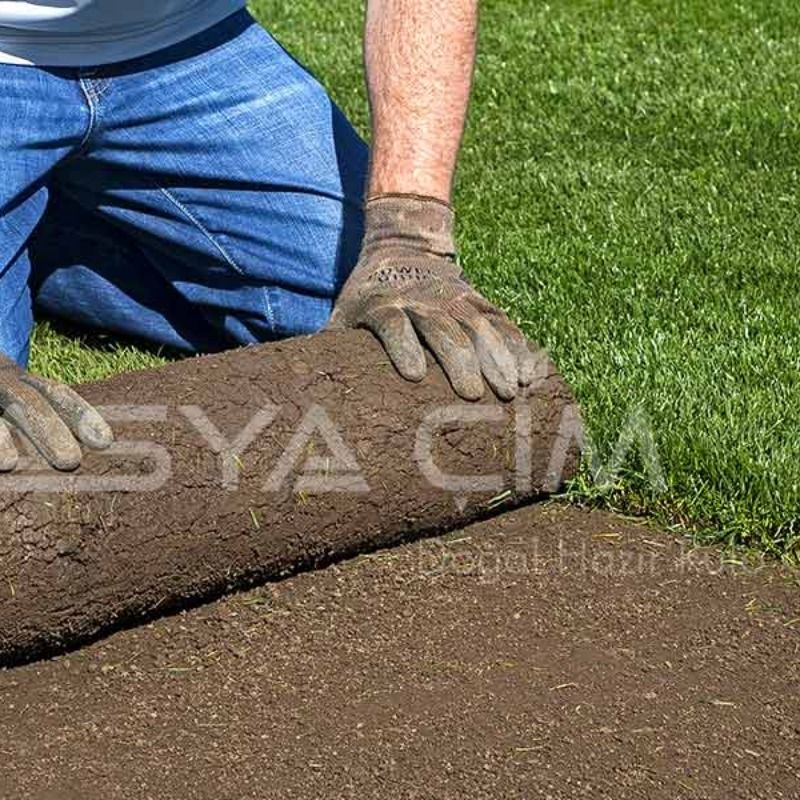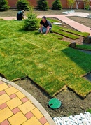 - Обустройство территории газонной травой начинают со стороны, где расположены рулоны. Это позволяет минимизировать переносы, осыпание грунта и разрушение корневой системы. Рулон начинают аккуратно раскатывать по прямой линии, постепенно перемещая его по участку. Следует помнить, что загибать края рулона запрещено. Для обхода неровностей, которые запланированы на лужайке с газоном, используют выкройку при помощи ножа. Начиная со второго ряда, все последующие ряды укладывают в шахматном порядке, при этом следует соблюдать правило: стыки различных междурядий не должны совмещаться друг с другом.