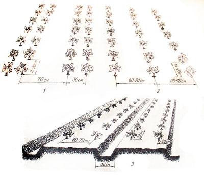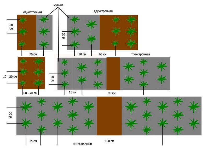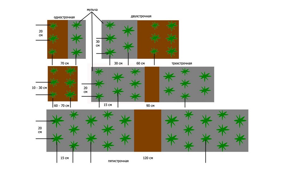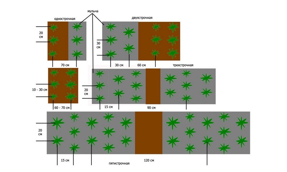 - Трехстрочная (на грядках). На одной грядке шириной более метра, растения высаживают в два ряда. Промежуток между растениями около 30 см.