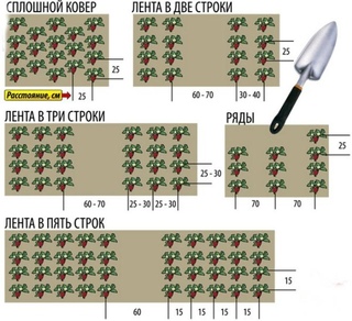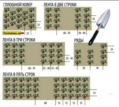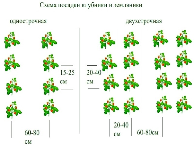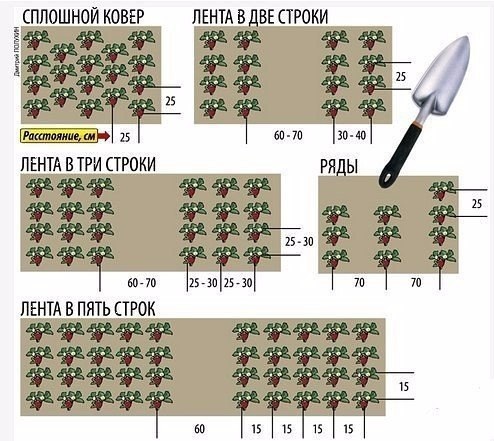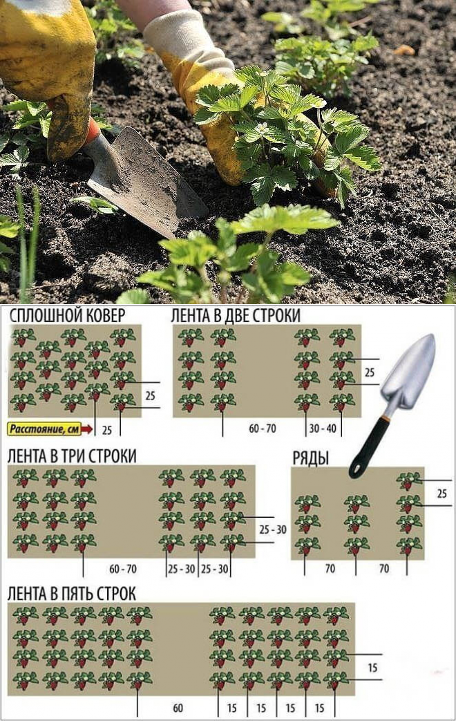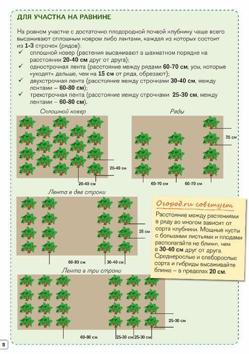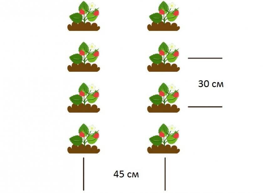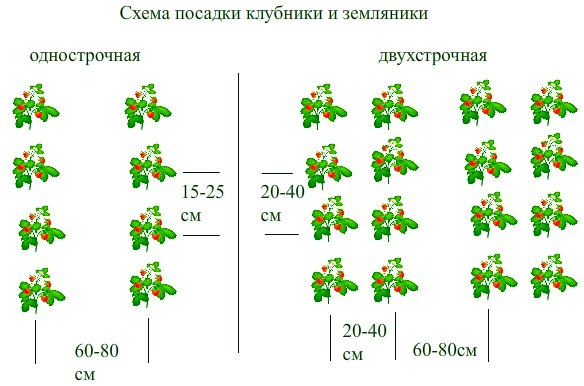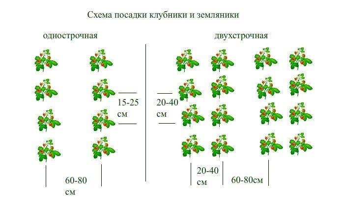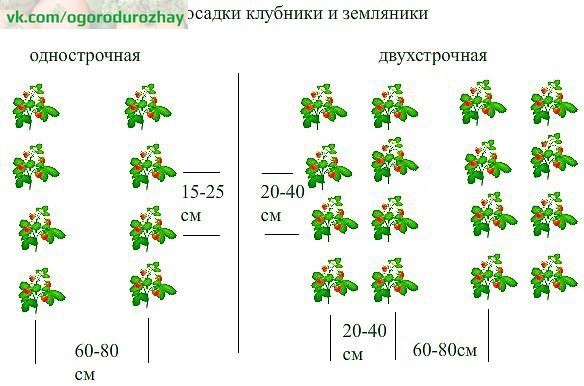 Расстояние между клубникой при посадке зависит от выбранного способа. Существует несколько схем посадки клубники: одно – и двухстрочная, кустовая и гнездовая, ковровая.