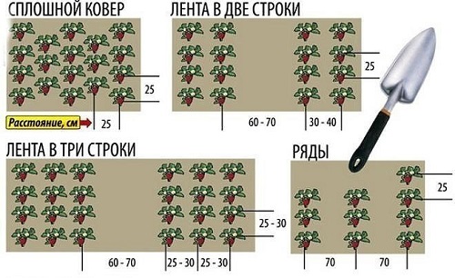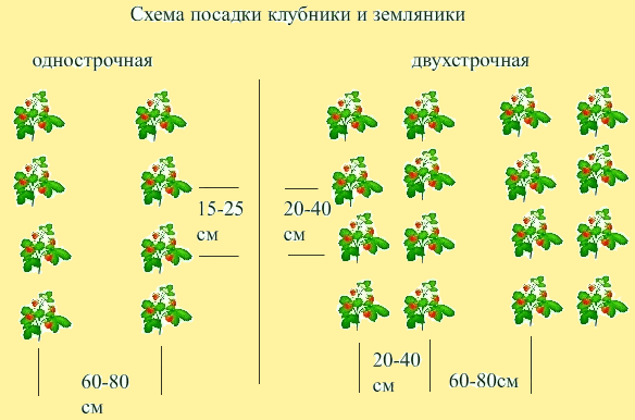 - Однострочная. Промежуток между рядами до 90 см, между кустиками – до 20. Со временем, пространство междурядок заполняется новыми кустами, образовавшимися за счет укоренения розеток. Те усы, которые «ушли» дальше, чем на 15 см от ряда – обрезают.