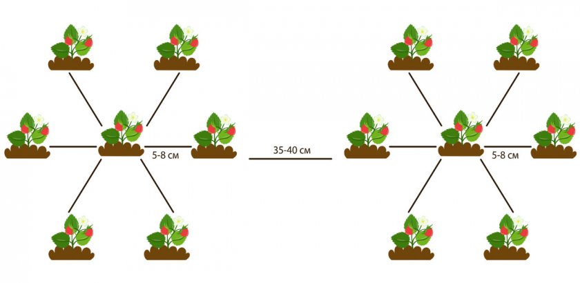 Вокруг центрального куста высаживаются еще 6 кустов на расстоянии 10 см друг от друга. Между соседними гнездами оставляют 30 см.