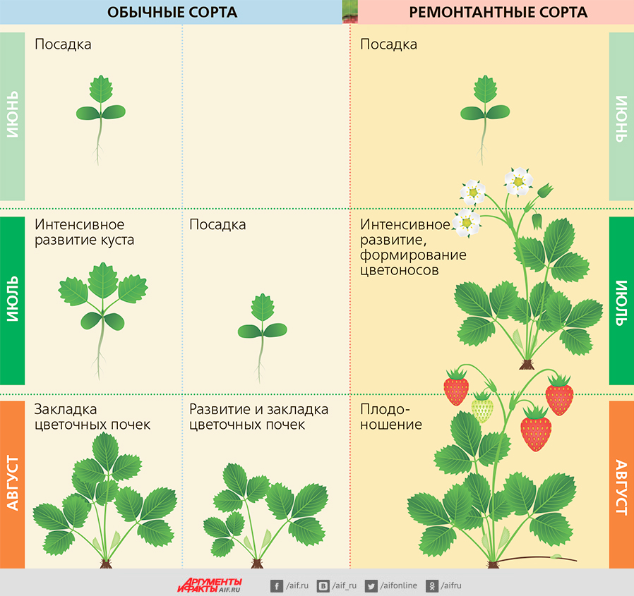 Everbearers производят два урожая в год, один в июне и один в августе. Дневно-нейтральные растения дают почти непрерывный урожай с мая до начала осени.