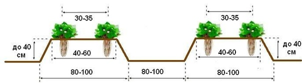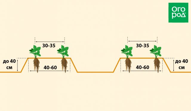 При стандартной схеме расстояние между рядами 40 – 45 см, между лунками 30 – 35 см. Глубина лунки при любой схеме 12 – 15 см.