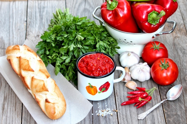 Тебе понадобится: 700 г помидоров, 1 кг сладкого перца, 2 острых перца, 150 г грецких орехов, 1 ч.л. хмели-сунели, 1 ст.л. копченой паприки, 1 пучок кинзы, 1 головка чеснока, специи.
